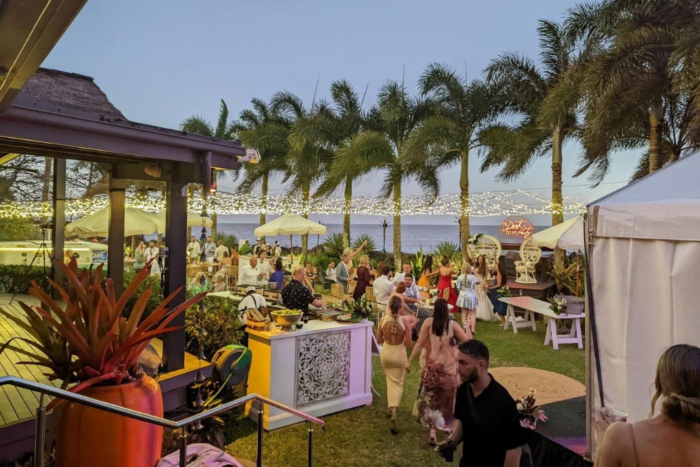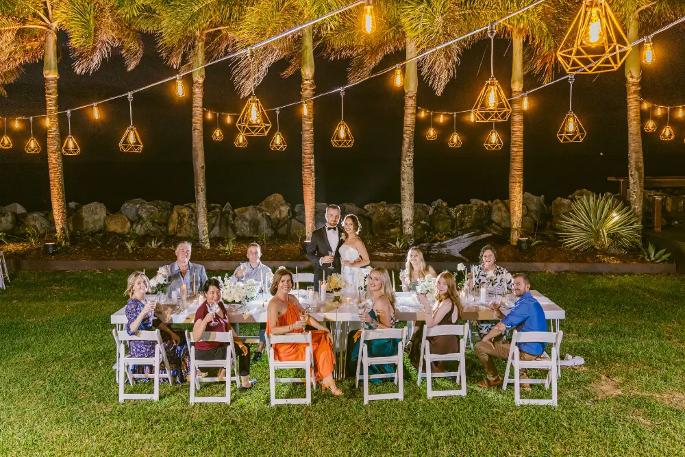 Delight your guests with a lavish tropical feast under twinkling lanterns in the lush beachfront gardens of Trinity Beach Cairns. This intimate, romantic setting crafts a celebration filled with joy, elegance, and lasting memories.